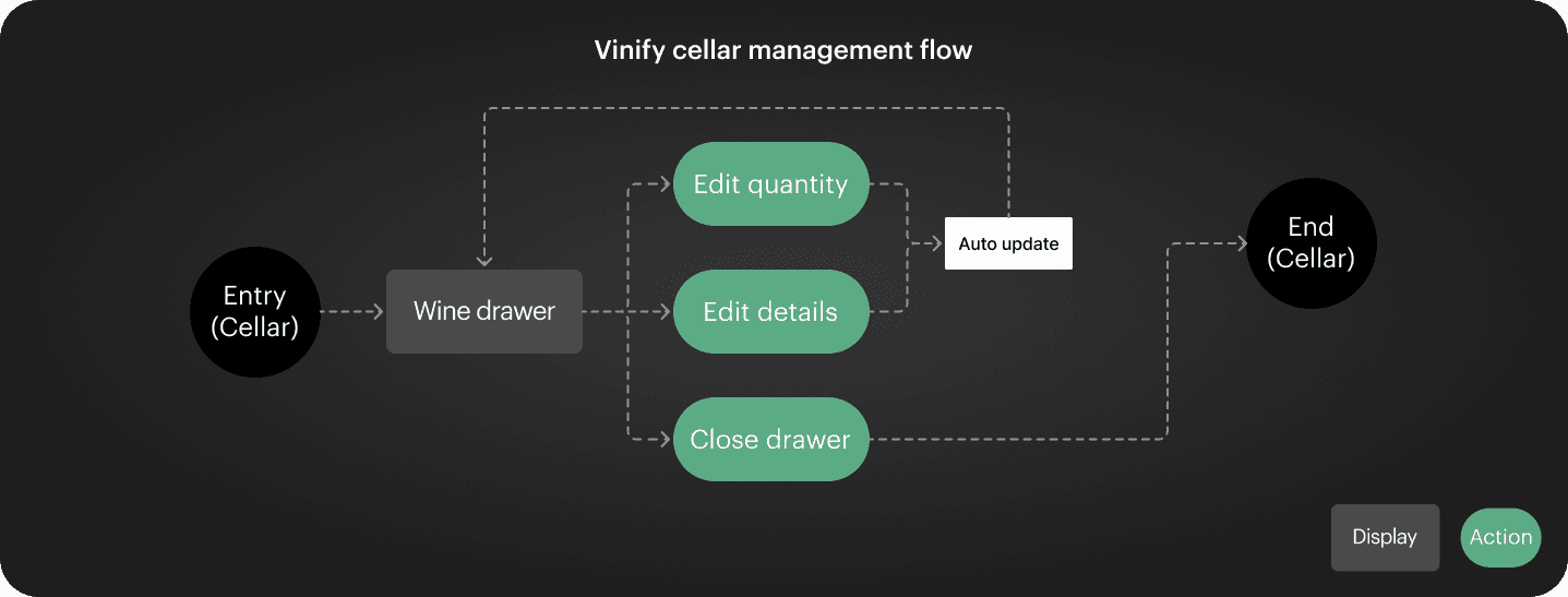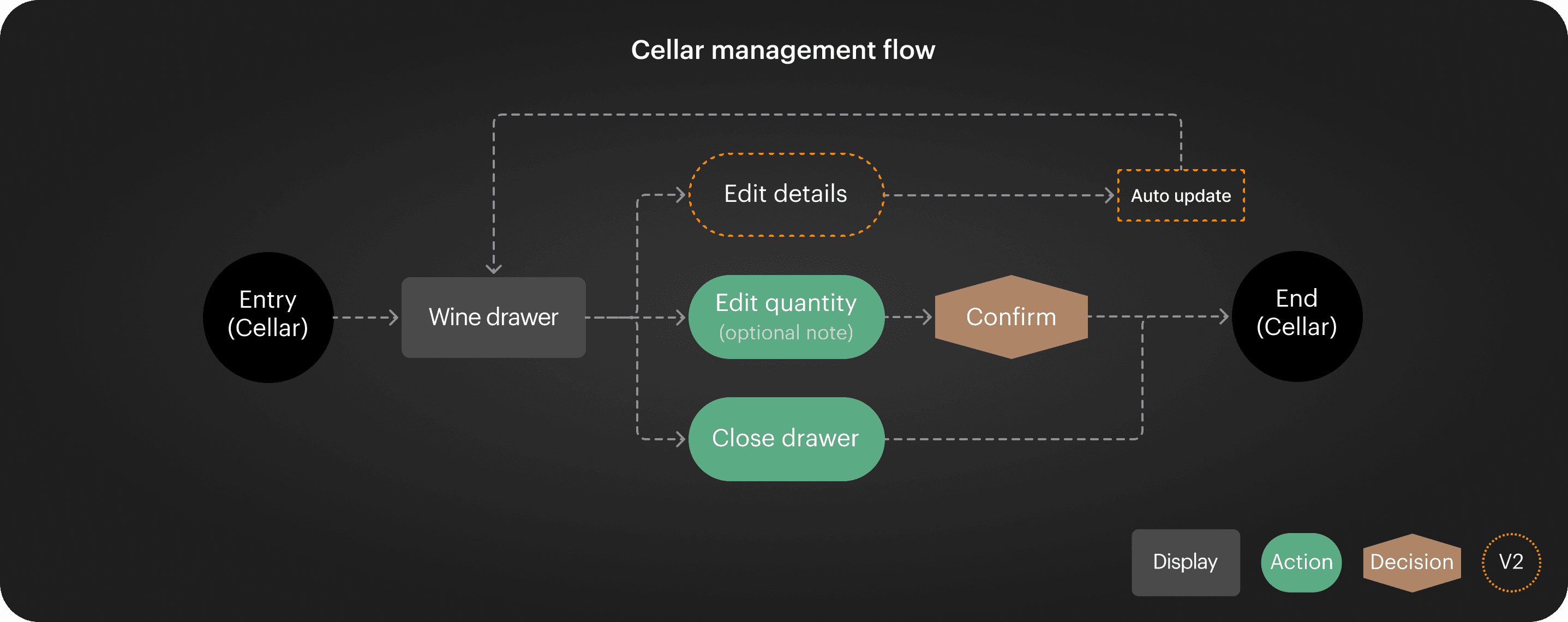 A straightforward management flow inspired by Vinify, though with alterations to fit Vivino, particularly for the option to add a cellar note regarding the quantity change