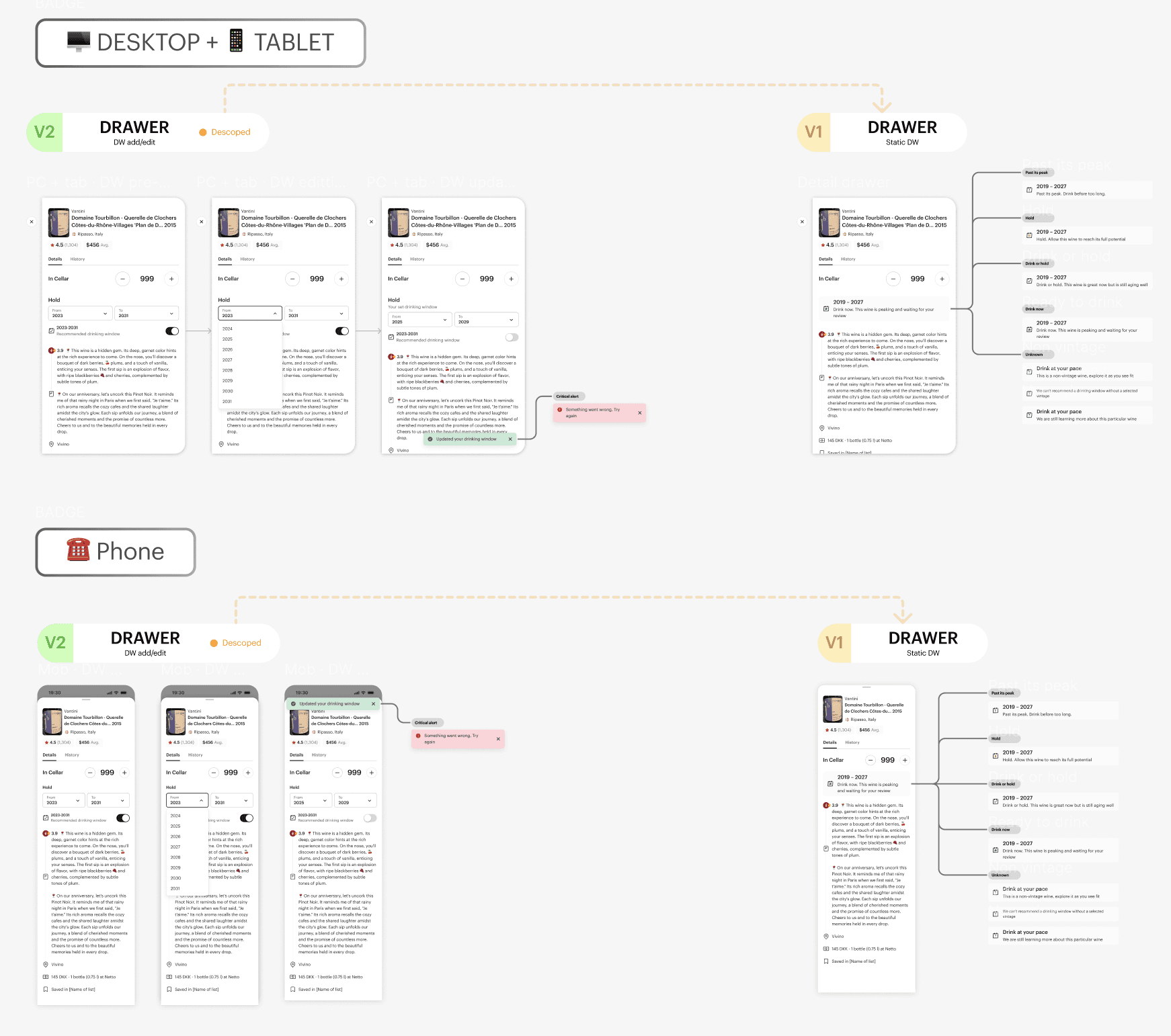 The project culminated in an extensive hand-over file, detailing responsive looks and flows for every aspect of Cellar on the web. Moreover, during the hand-over, it was decided to descope the option to change the drinking window on the web. Having already structured the flow in Figma, I created a descoped version while retaining the V2 solution. Due to the hand-over file's extensiveness and changes I sought to: