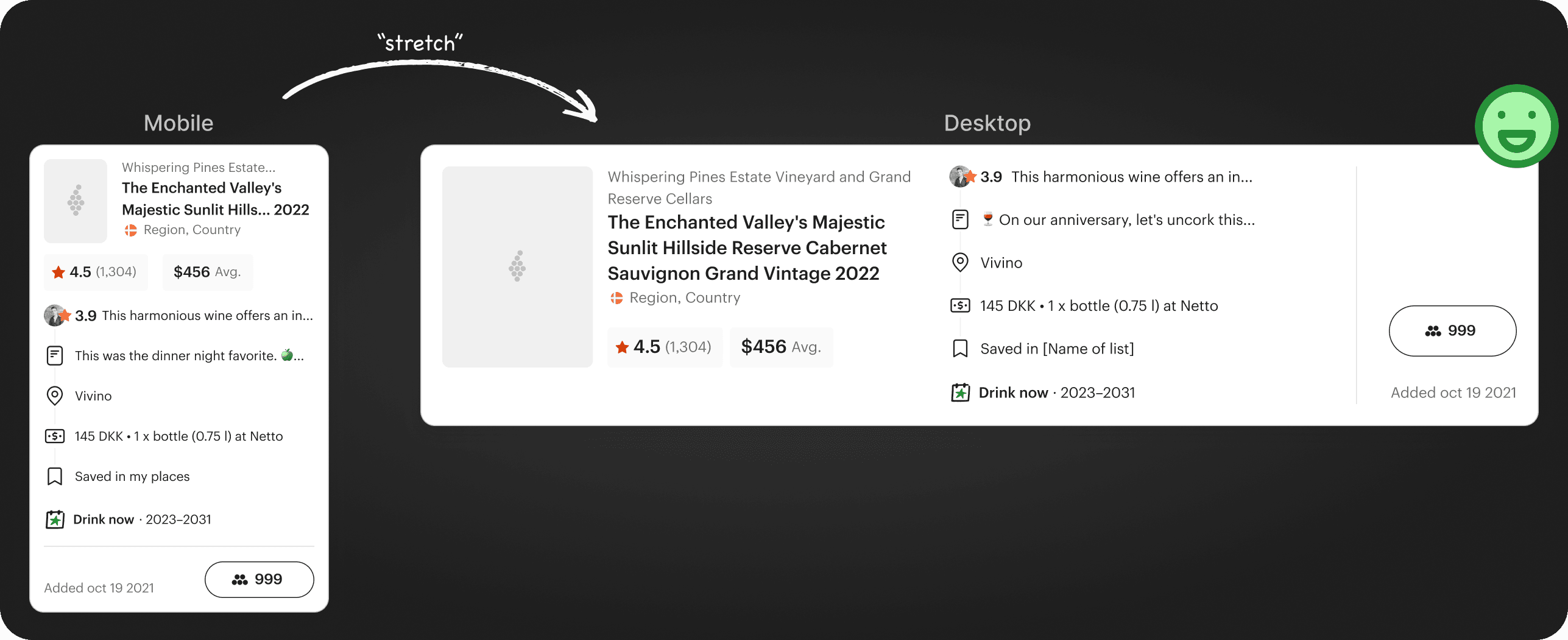 Taking a standing point in the early ideas, decided to design the web responsiveness from the bottom up, starting with a mobile look first. Having recently explored the Vivino list cards, I already had a near final vision of their appearance. From there, it was primarily a matter of "stretching" the cards to fit larger screens. Doing this meant: