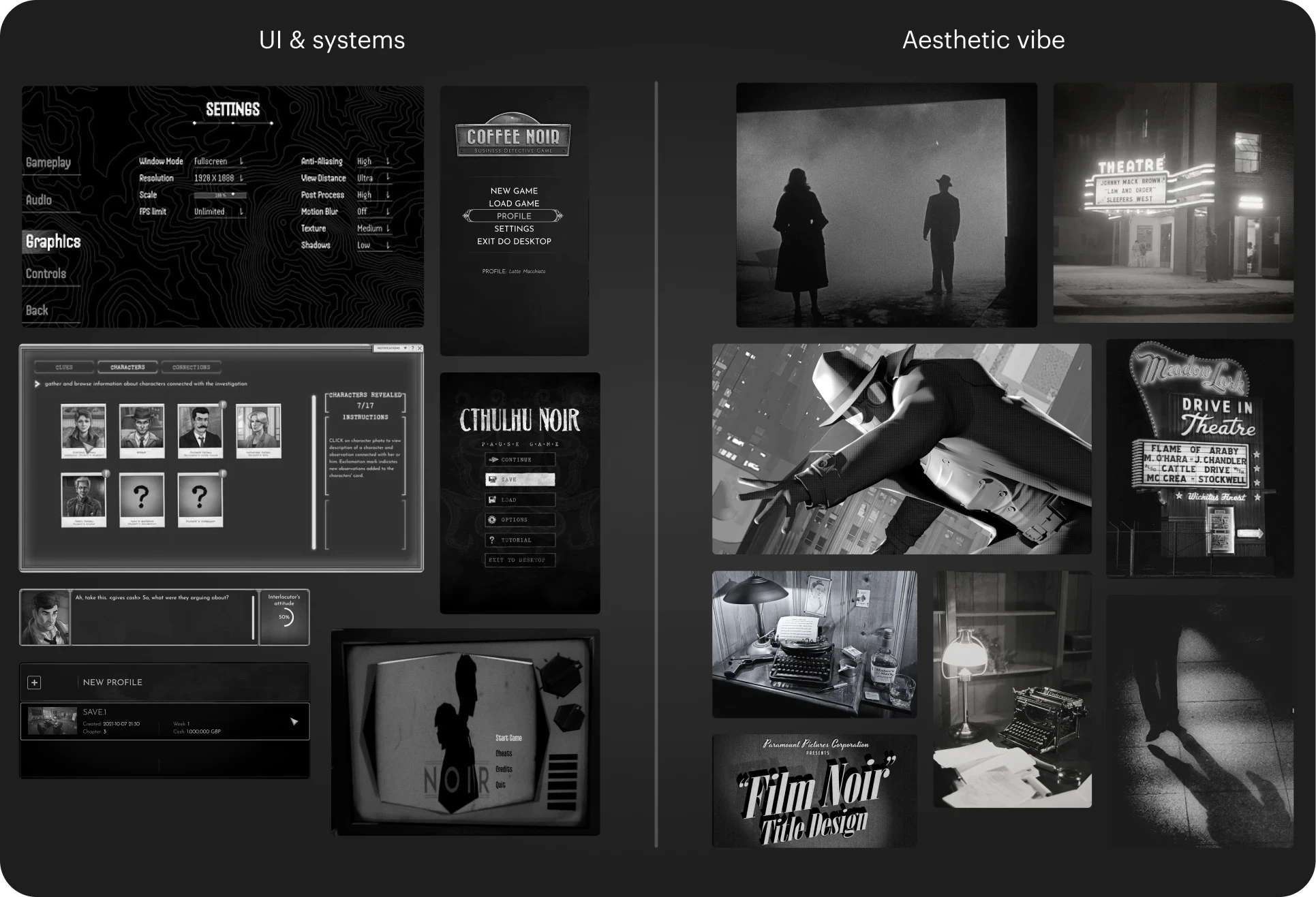Snippet of the moodboard for both game UI and noir vibe