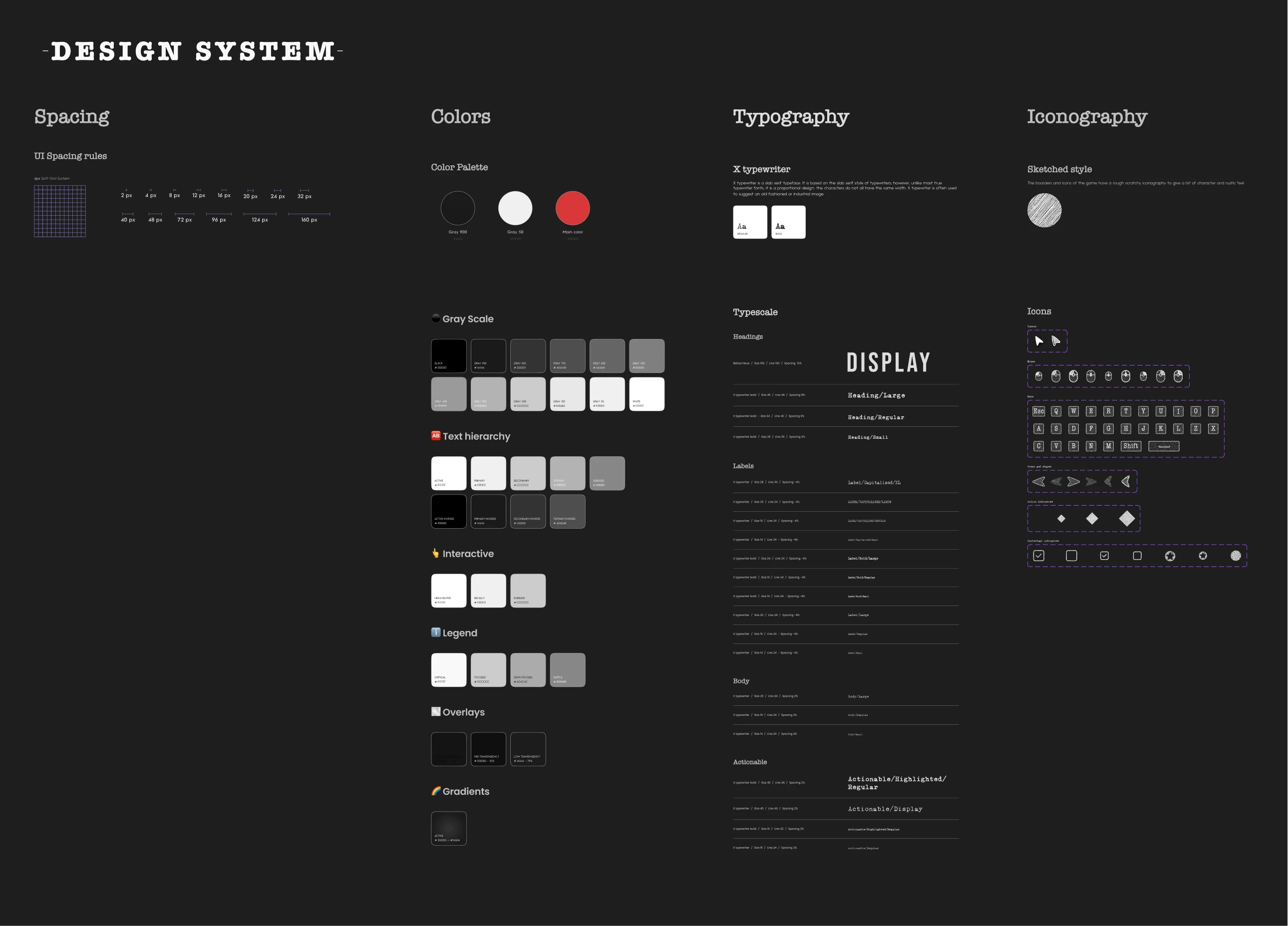 Building on the research, I set up a small design system before starting pixel work. As the game would include a fair amount of UI, I created this system to ensure consistency in spacing, colors, typography, and iconography. This framework would benefit development but also improved the final product by:
