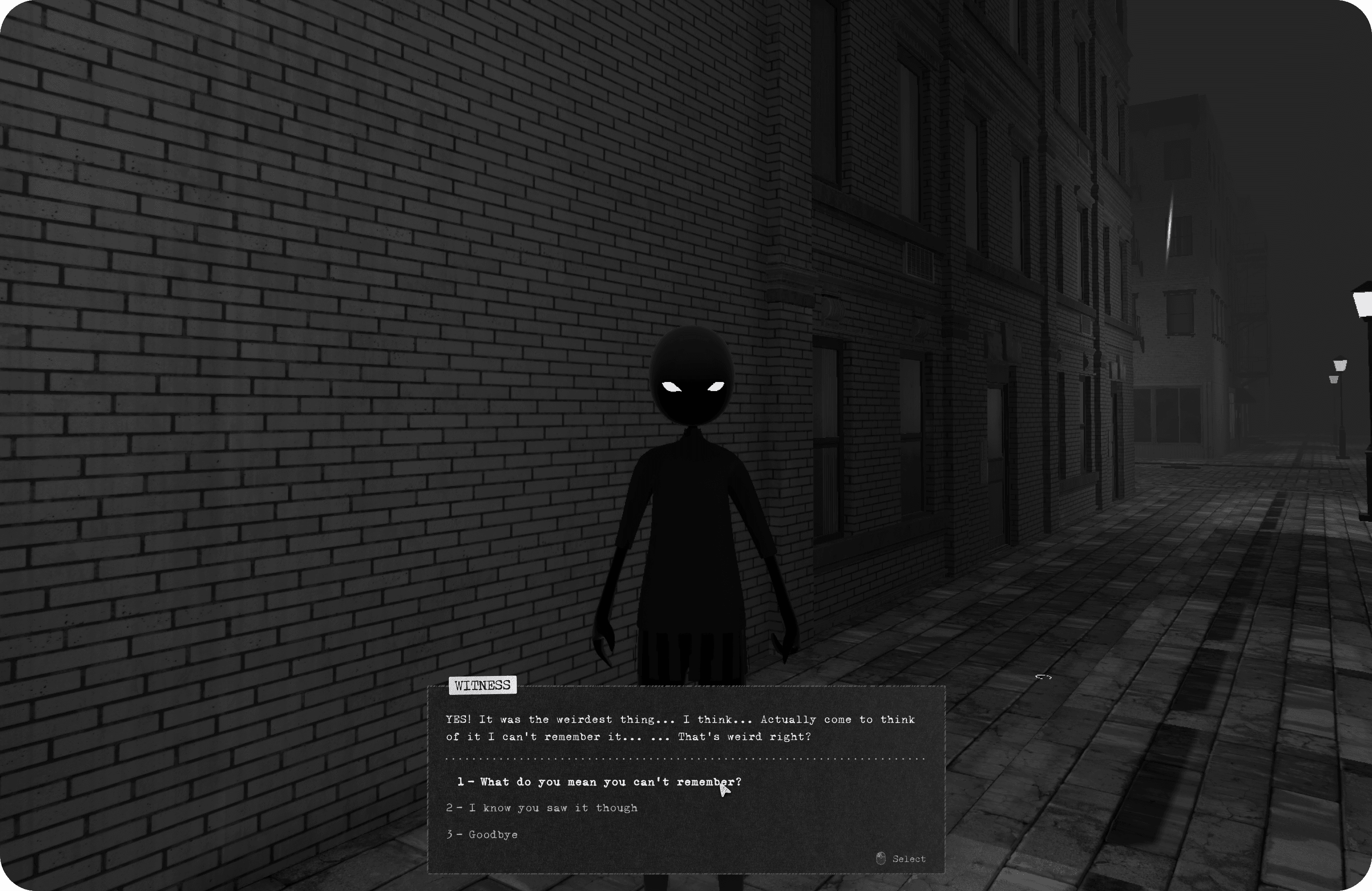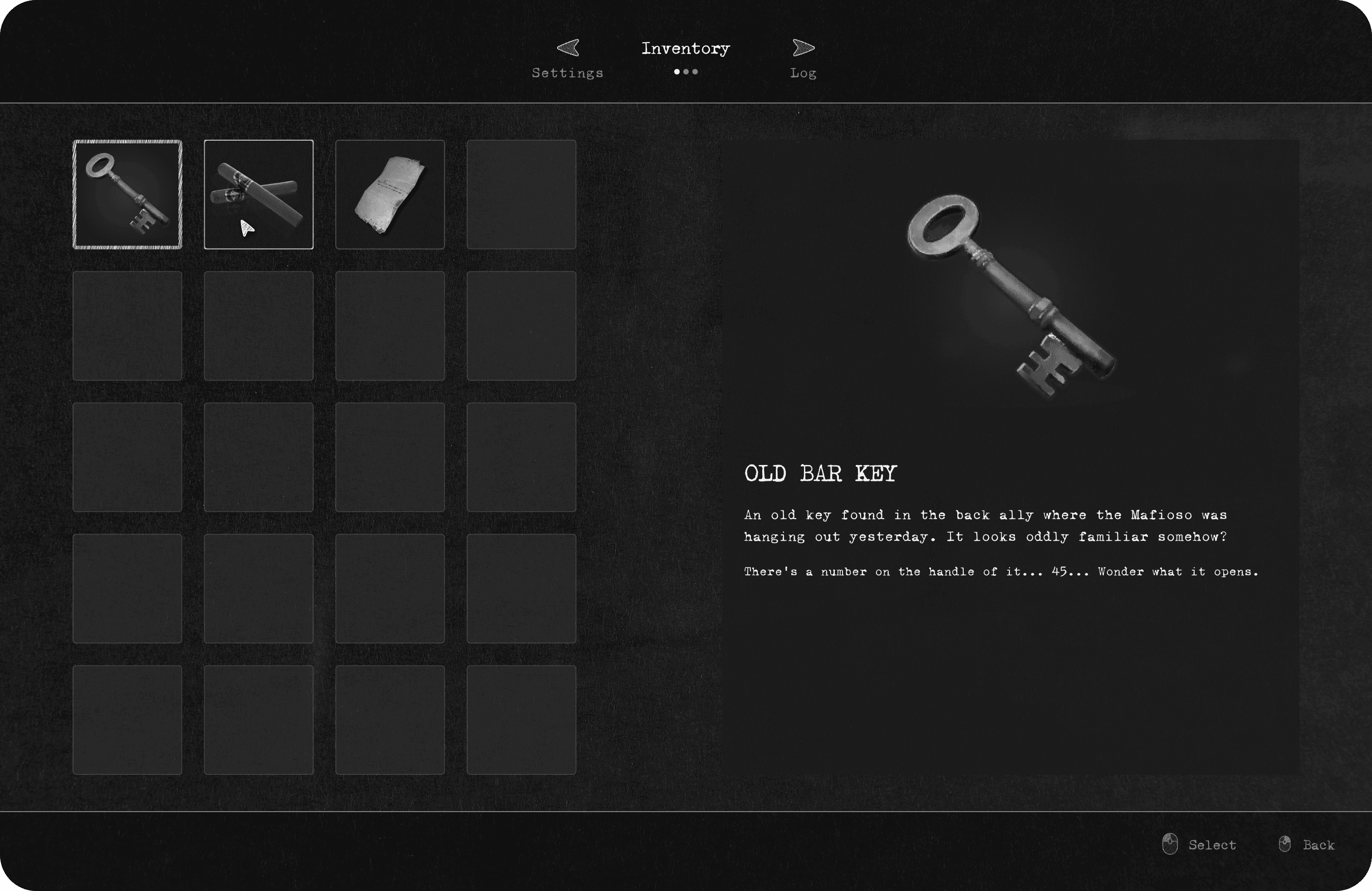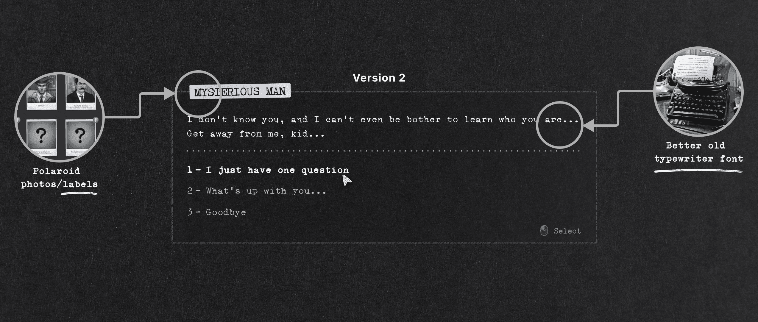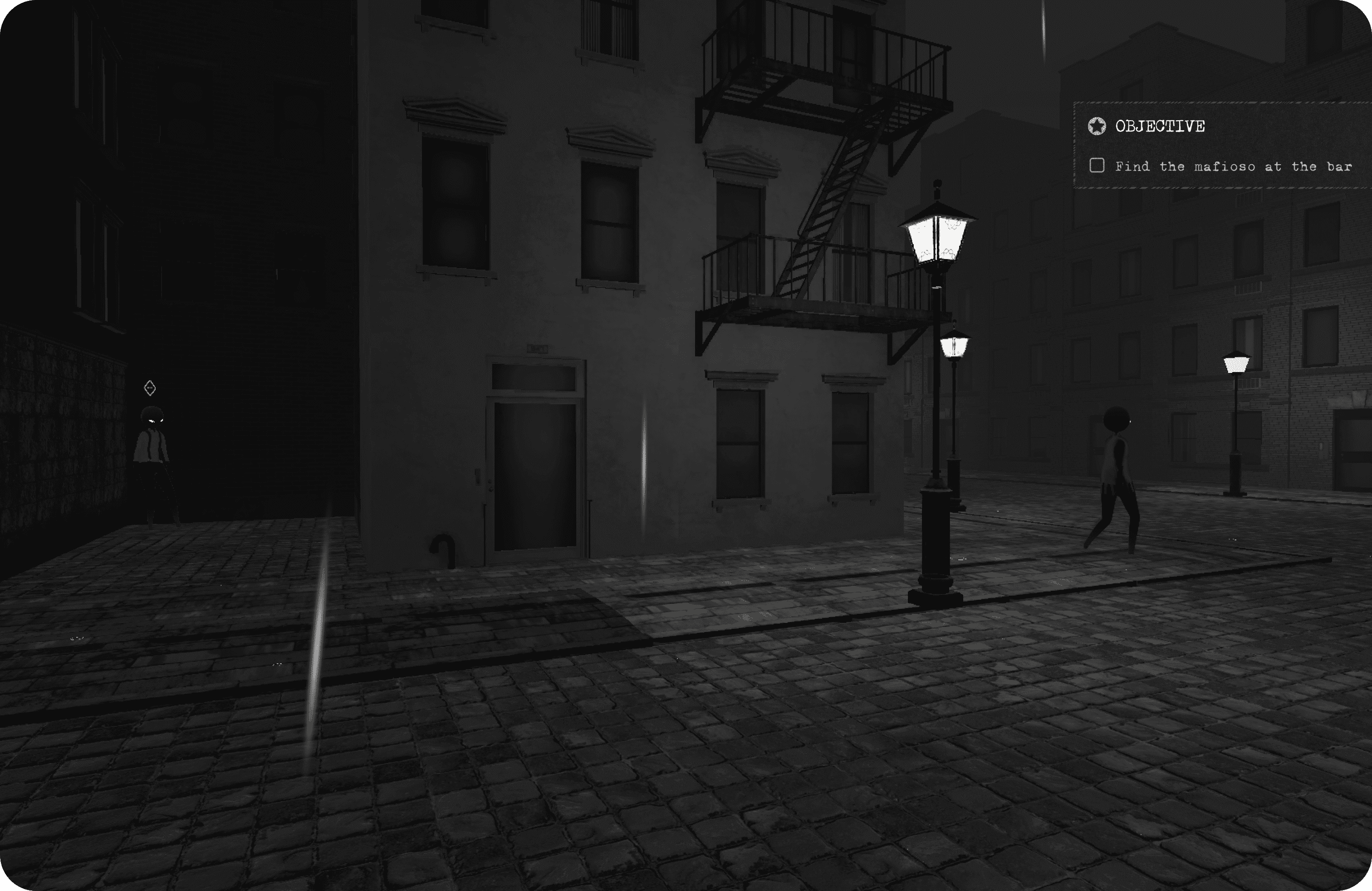 A minimalistic UI that fitted the noir aesthetic, though impacted by descoped choices to meet the finish line